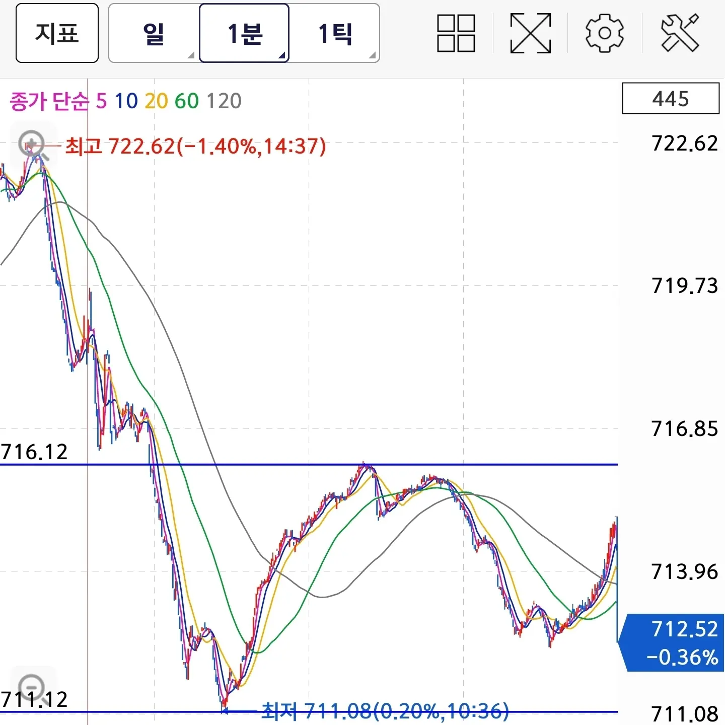 반등을 하였으나 14시 33분 저점까지 빠진 후 재 반등, 1분봉상 현재 박스권 및 큰파동으론 쌍바닥 전고까지 올라와 준채 마감 하였습니다.