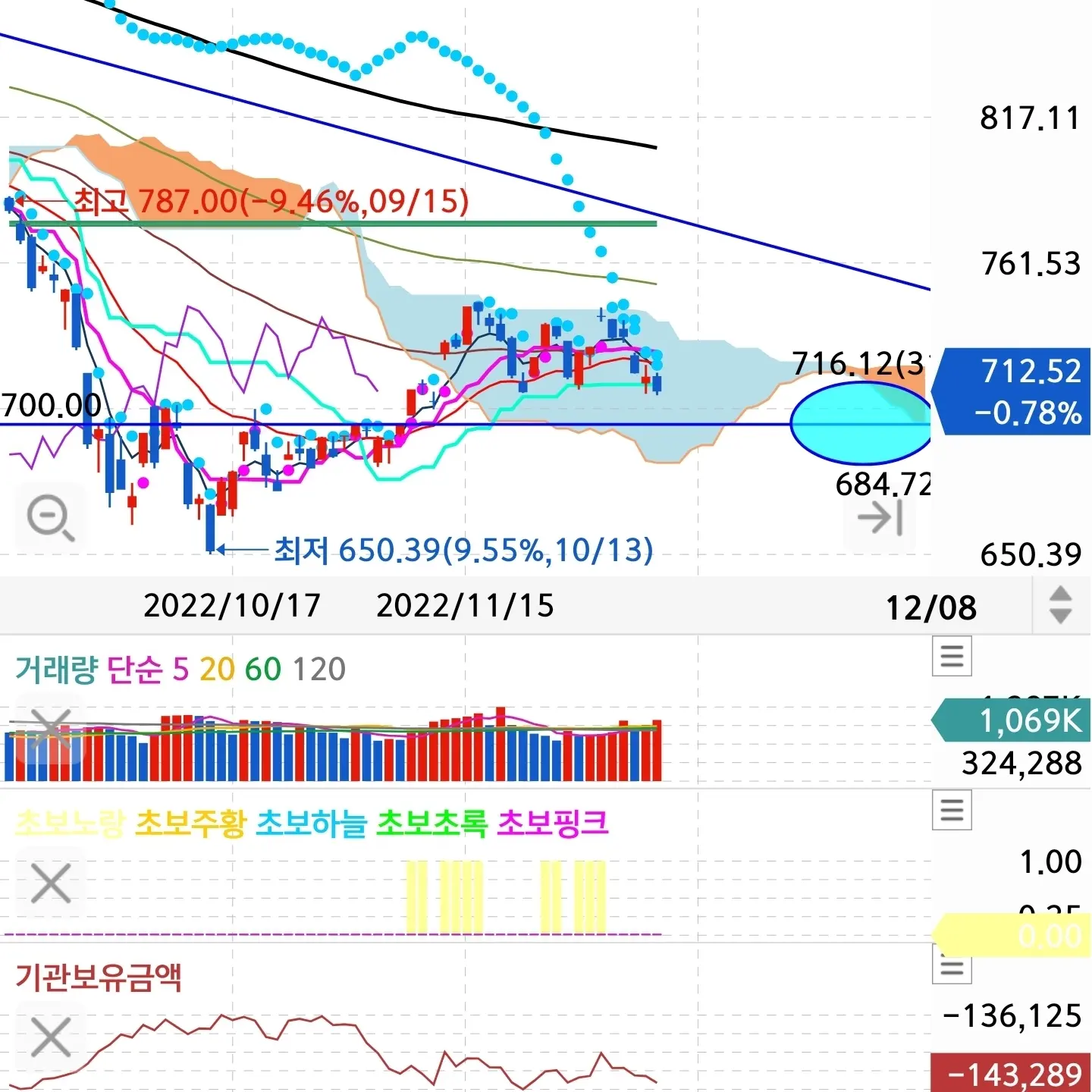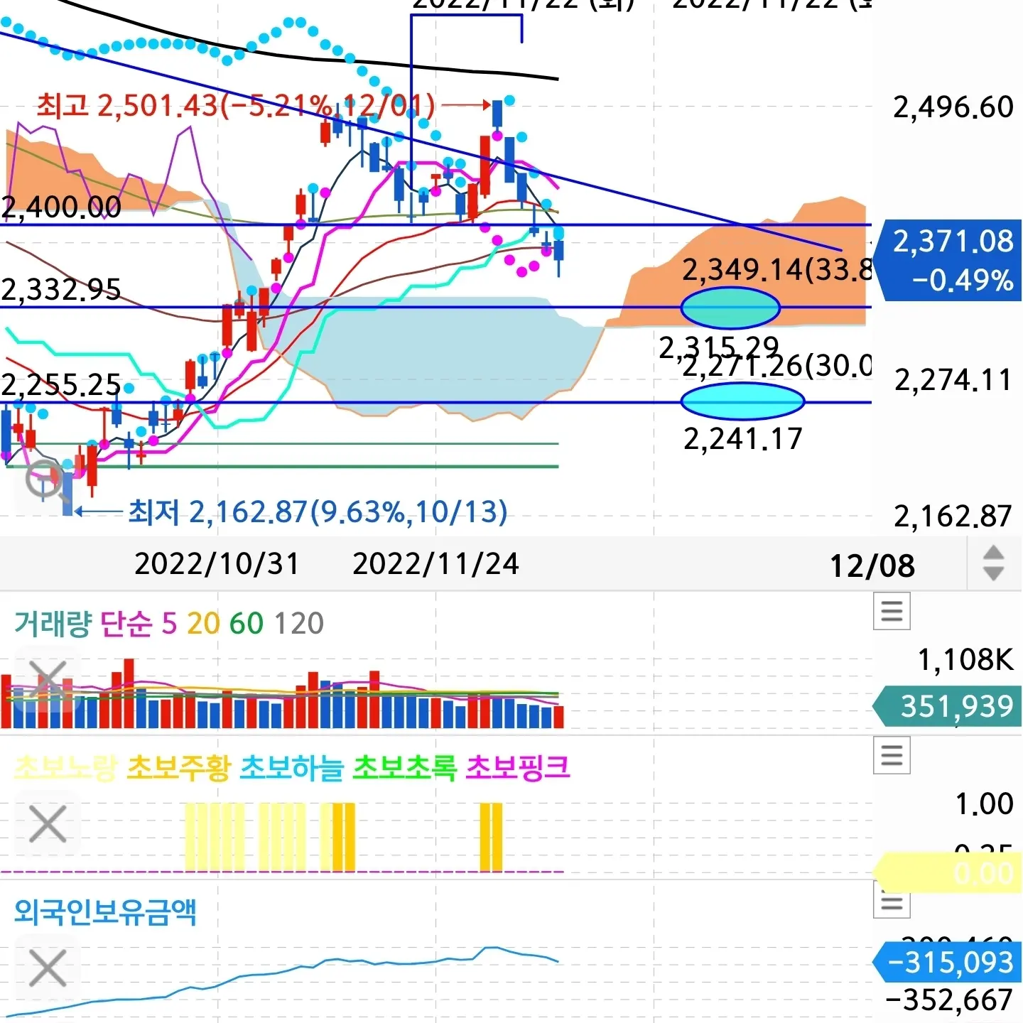 코스피는 이평선 지지 라인은 없는 상태 이며 일목균형표 선행스팬2번 부근 매물대 2,332P 한군데, 나머지 2,255P 한군데 토탈 두 라인까지 주가가 열여 있음을 보여 주고 있습니다.