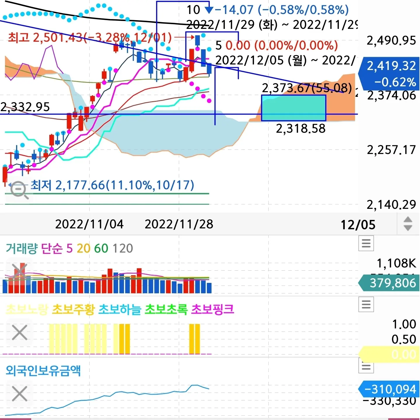 일목균형표 전환선, 기준선, 후행스팬, 선행스팬1, 선행스팬2 활용하여 지수 분석시 코스피,코스닥 10일 신저가로 뜨는 바람에 당분간 매수는 미뤄두고 11월29일 저가를 기준으로하여 10일 신고가 뜨는날 그날 매수 포인트 잡아도 되니 12월12일 날 지켜보면 될 듯 합니다.