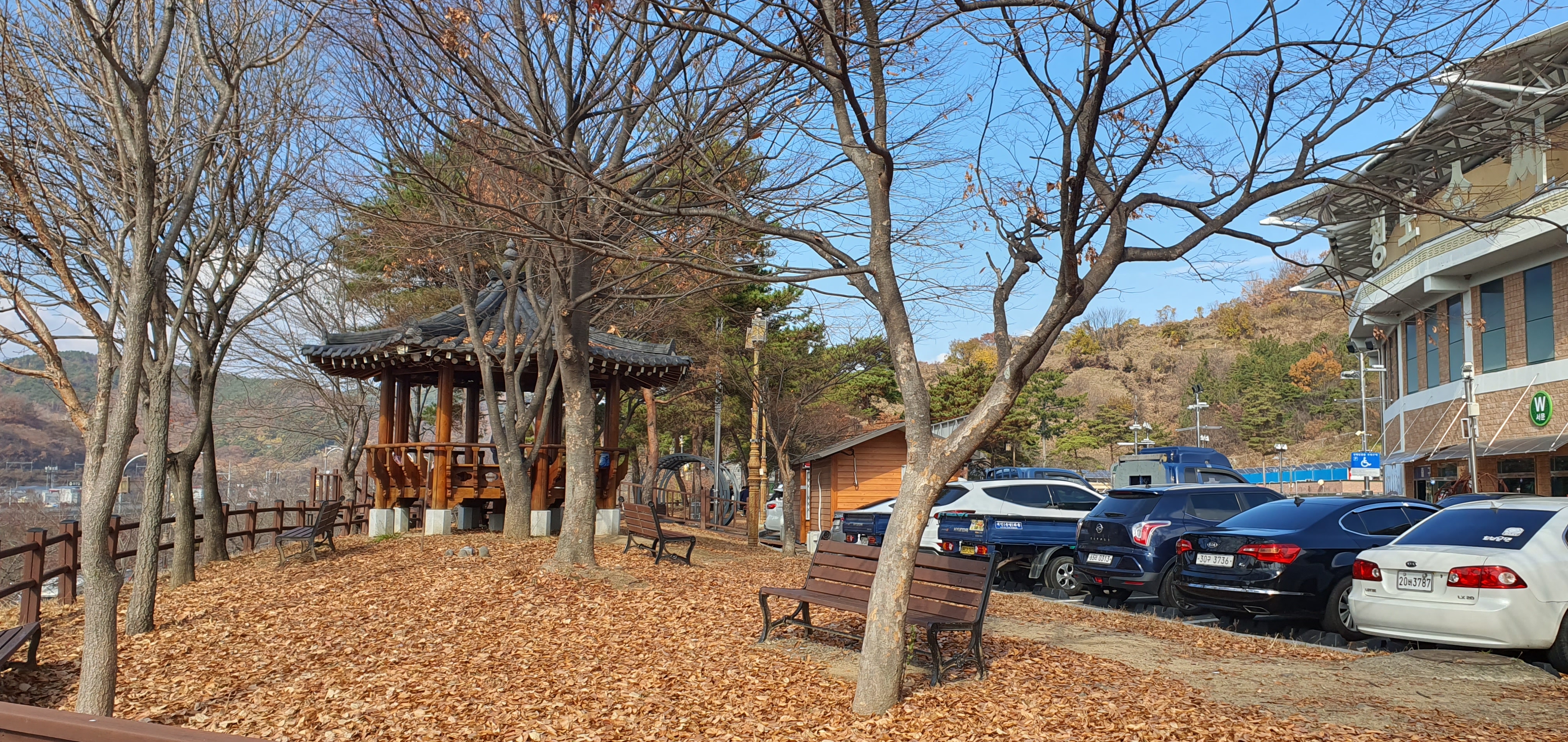 오른쪽 주차된 차량을 빗겨가면서 구름다리(?) 비슷한 계단을 통해 올라가니 바로 경기장 앞 정자...