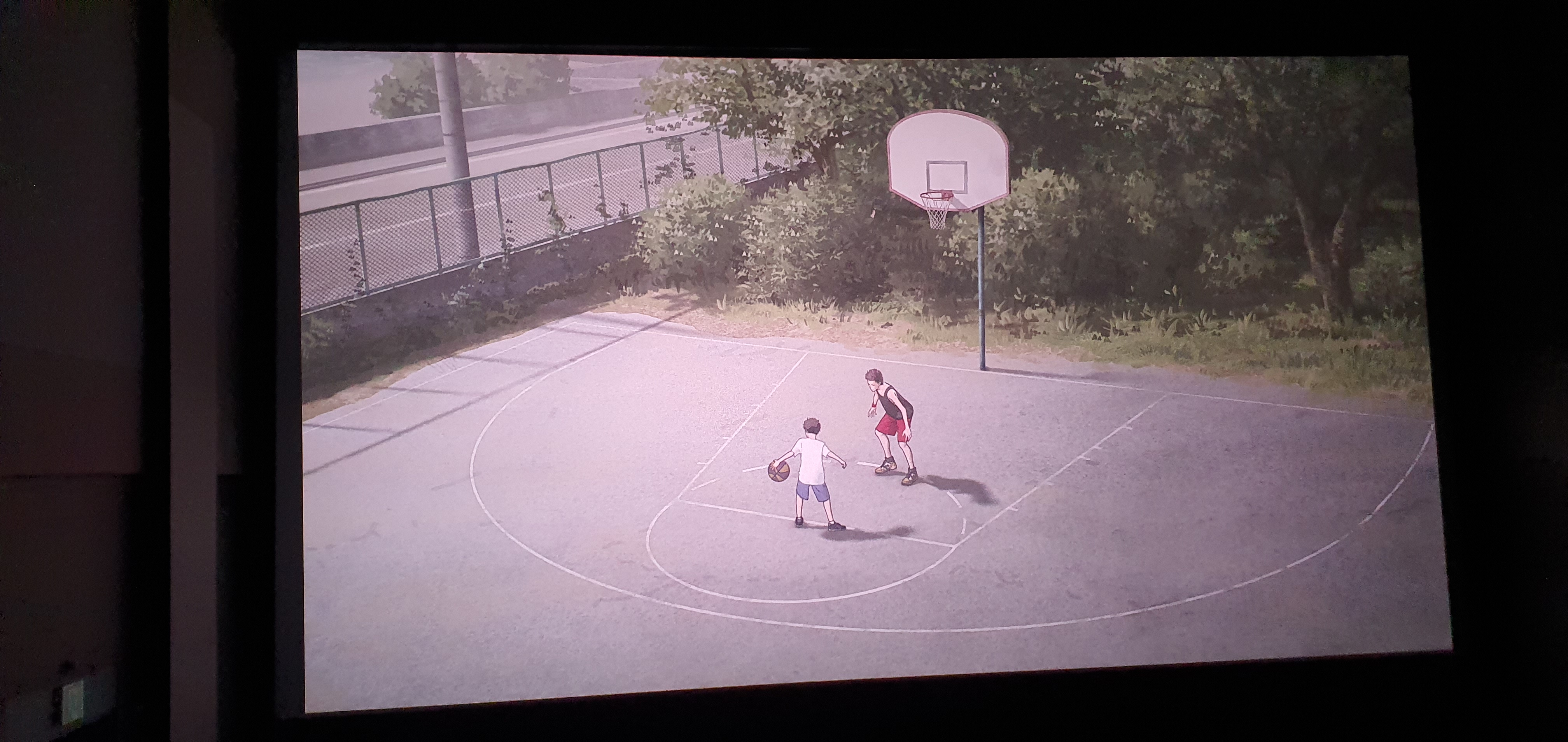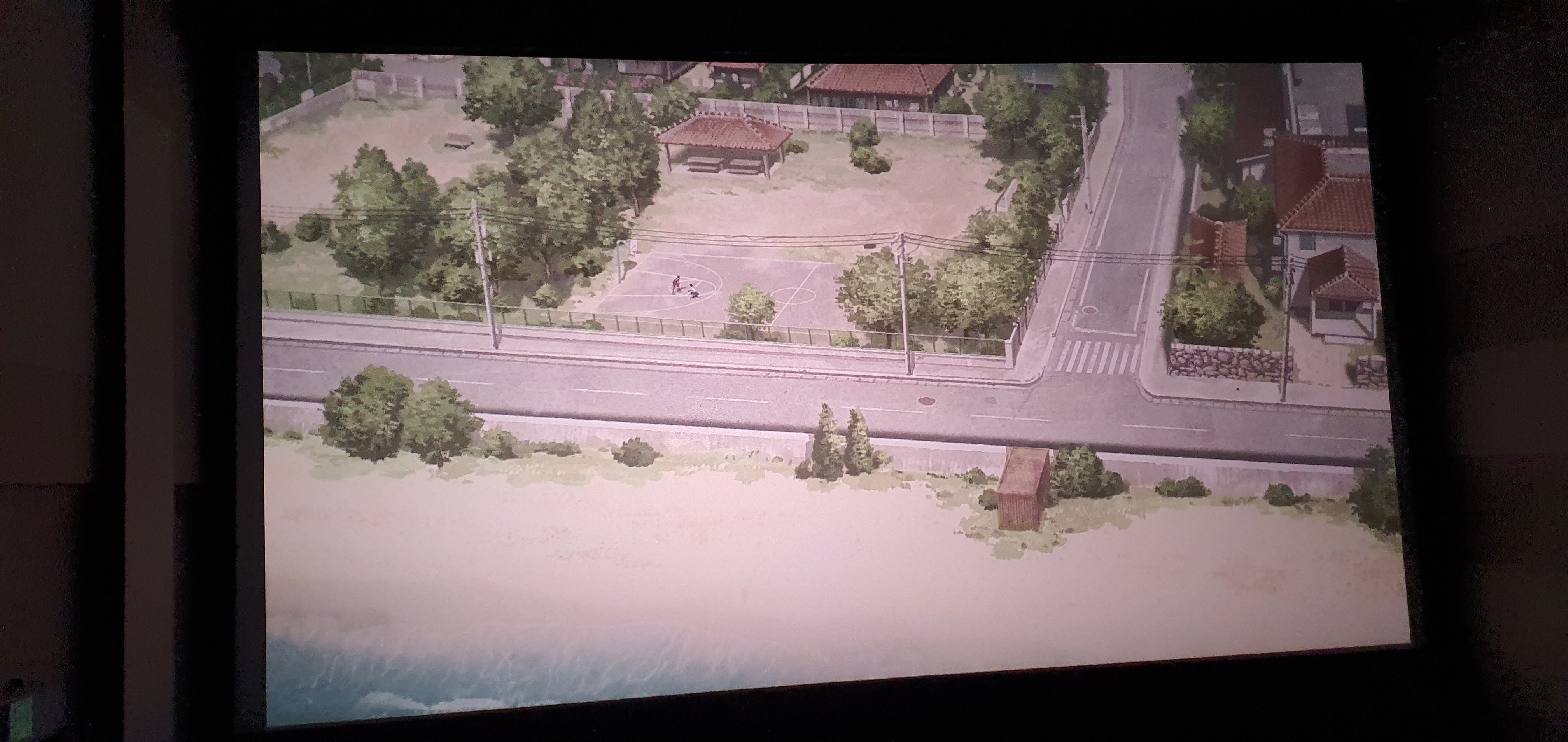 상영이 시작되고 바닷가 앞 도로 옆 농구장에서 농구공이 바닥에 닿이는 소리가 들립니다.