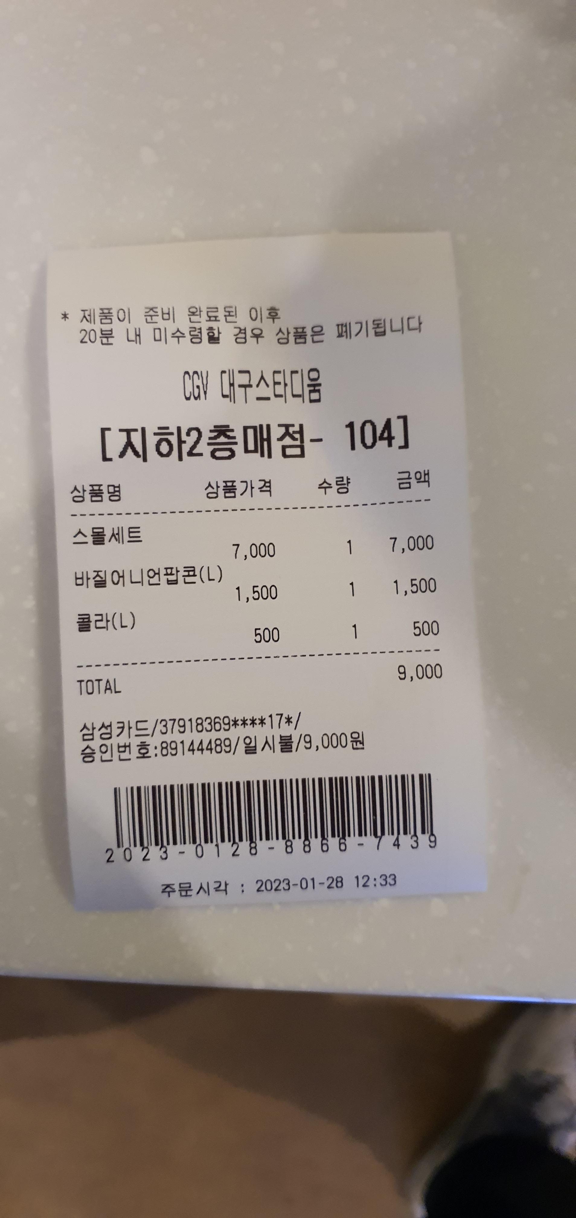 팝콘 1개, 콜라1개를 주문하고 영수증 사진 찍고 바로 상영관 쪽으로 이동 했습니다. 발권 확인하고 잠시 주변 정리 하는김에 사진 찍어 보았습니다.