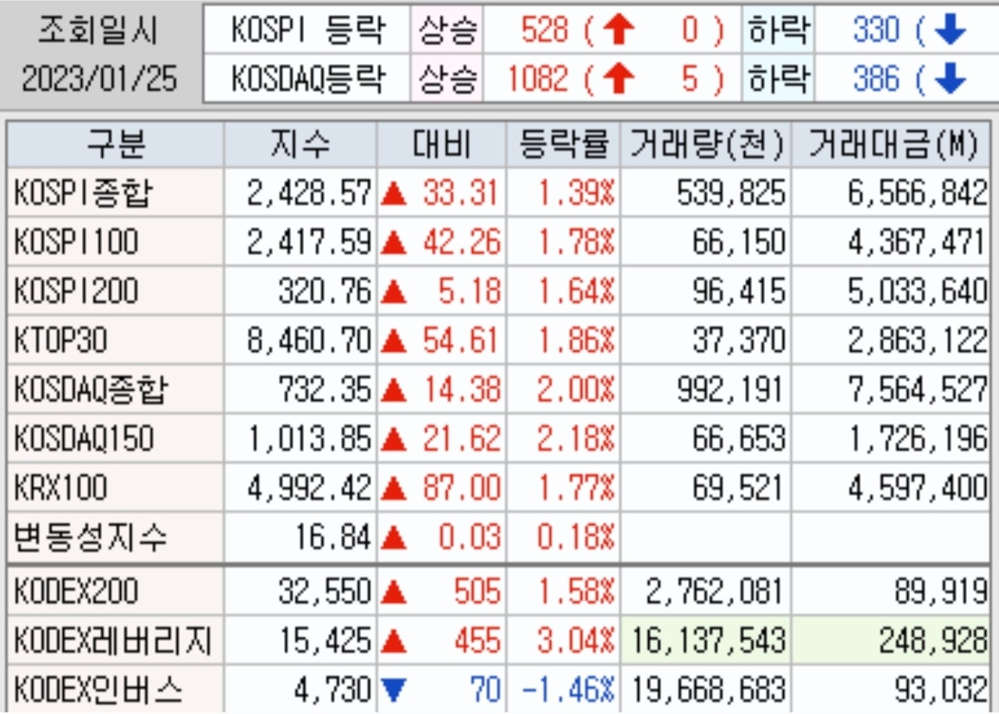코스피는 528 종목이 상승 하였고, 코스닥은 1082 종목이 상승을 하였습니다.