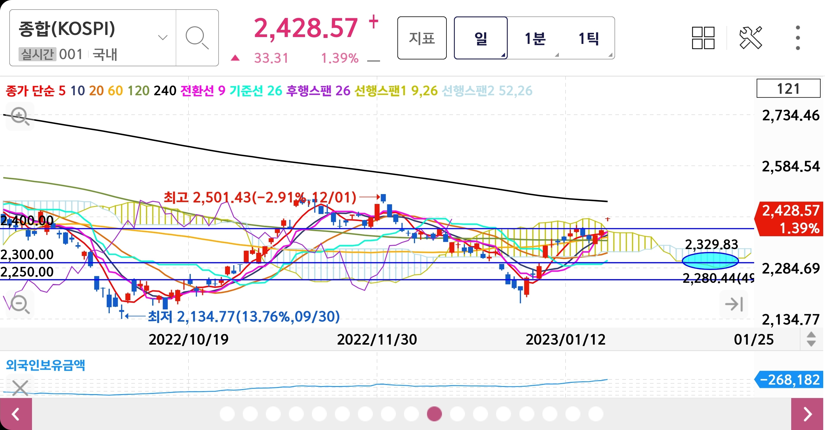 코스피는 1.39% 오른 2,428P 양봉 도지 캔이 출현 하였습니다. 240일선 저항 과는 이격이 좀 있으며 일목 양운을 돌파 및 전고 언덕을 돌파 하게 된다면 추세가 우상향으로 바뀔 수 있으나 단기 고점 이며 갭상승, 도지캔들로 인하여 조정이 오는 구간이 올 것이라 생각이 듭니다.