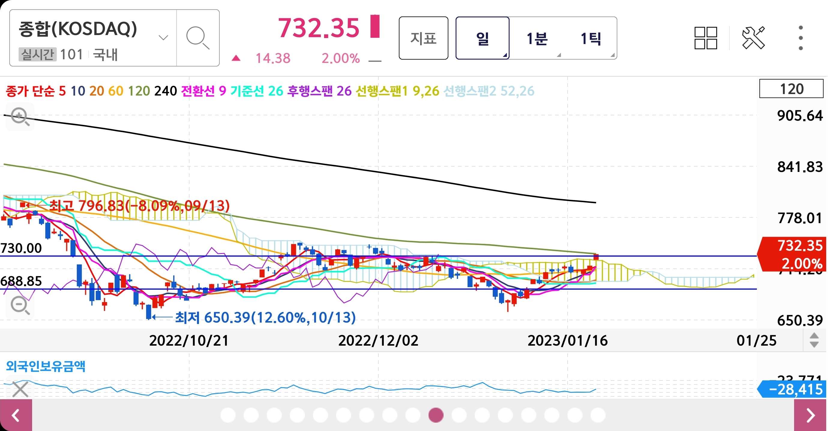 코스닥은 2% 오른 732P 양봉 캔들 출현 하였습니다. 120일선이 저항으로 작용하고 있으며 돌파 하여 전고 언덕을 돌파 해 주었으면 하나 갭이 있고 단기 고점이니 조심하면서 매매를 해야 할 것 같습니다.