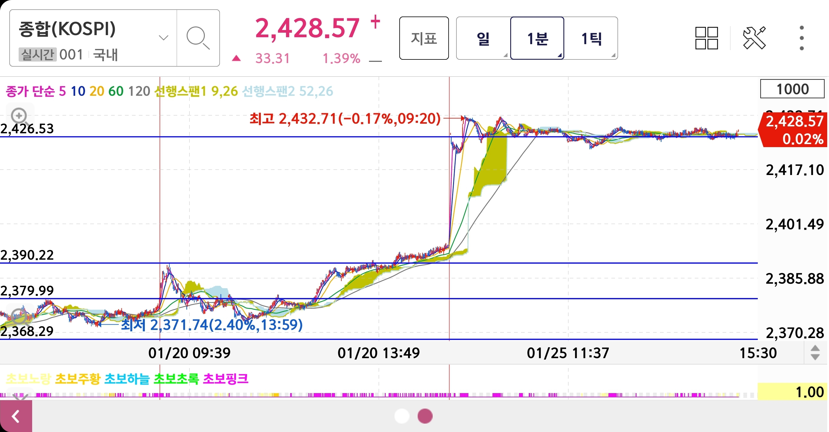 1분봉상 갭상승 하여 바로 시가 이탈 나왔으나 09시16분 시가 회복 하여 09시20분 금일 고가 2,432P 찍고 난 뒤 부터 시가 부근에서 오르락 내리락 하며 선행1번 돌파 및 선행2번 위에서 마감 하였습니다.