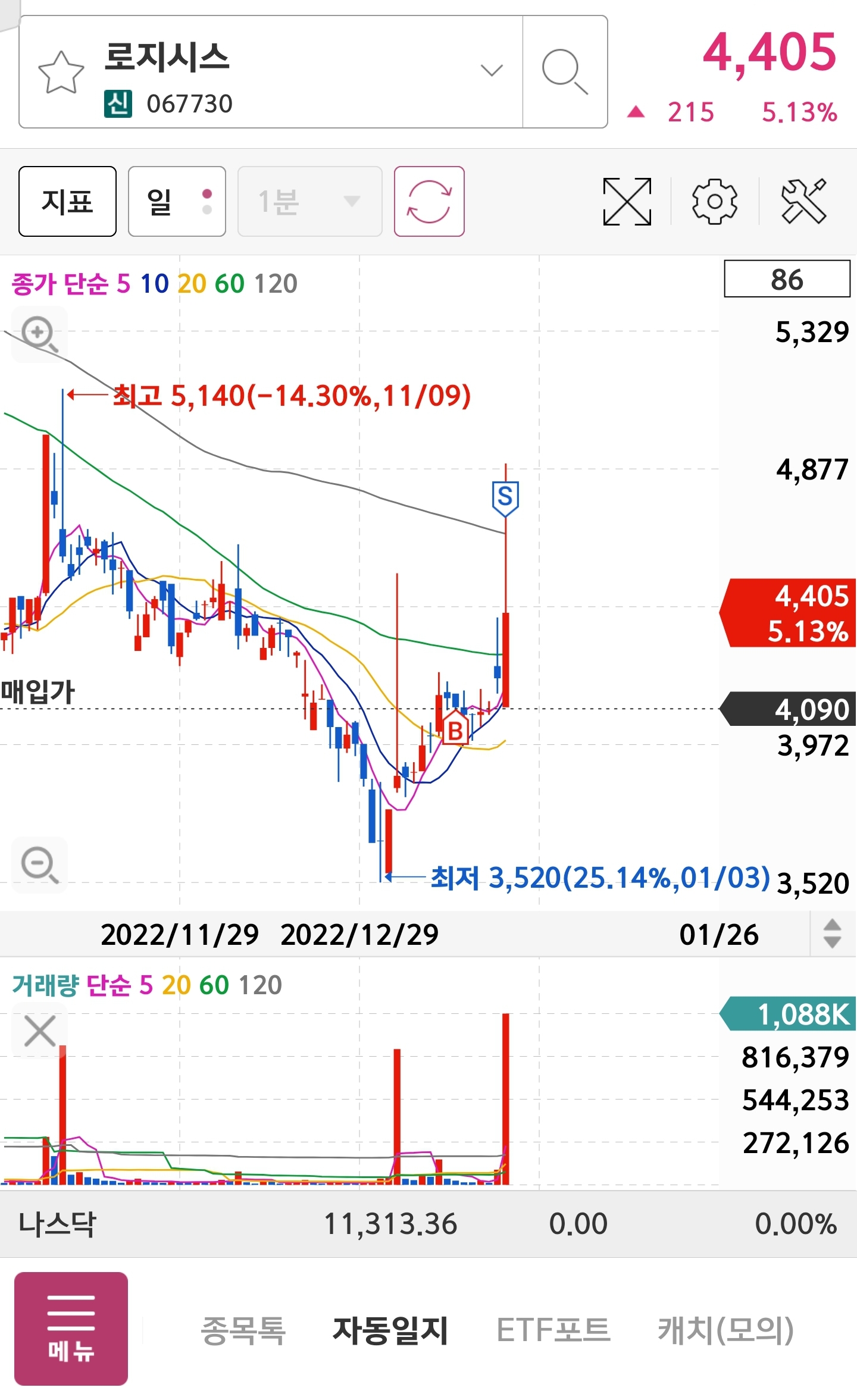 3번 계좌에 로지시스 종목 15시08분 수급이 들어와 자동매도감시 15.3% 절반 매도 하였습니다.