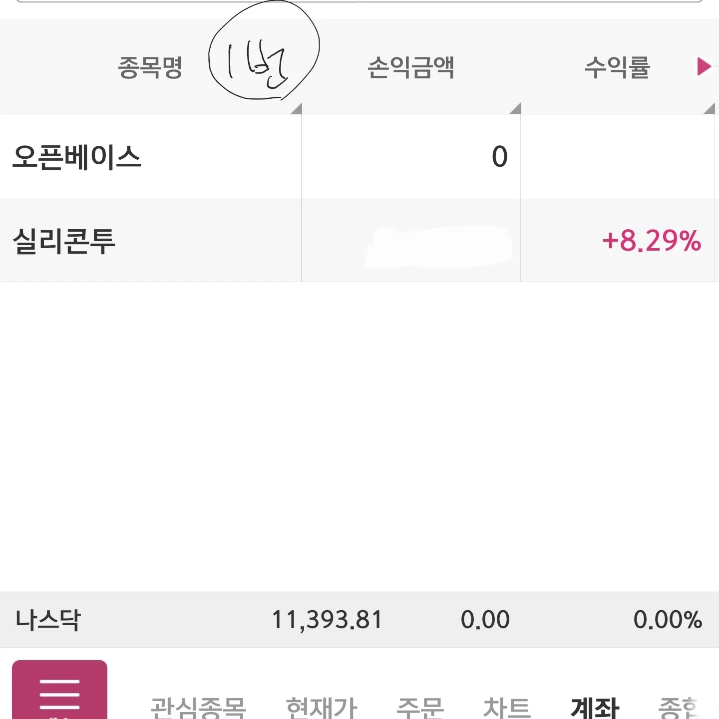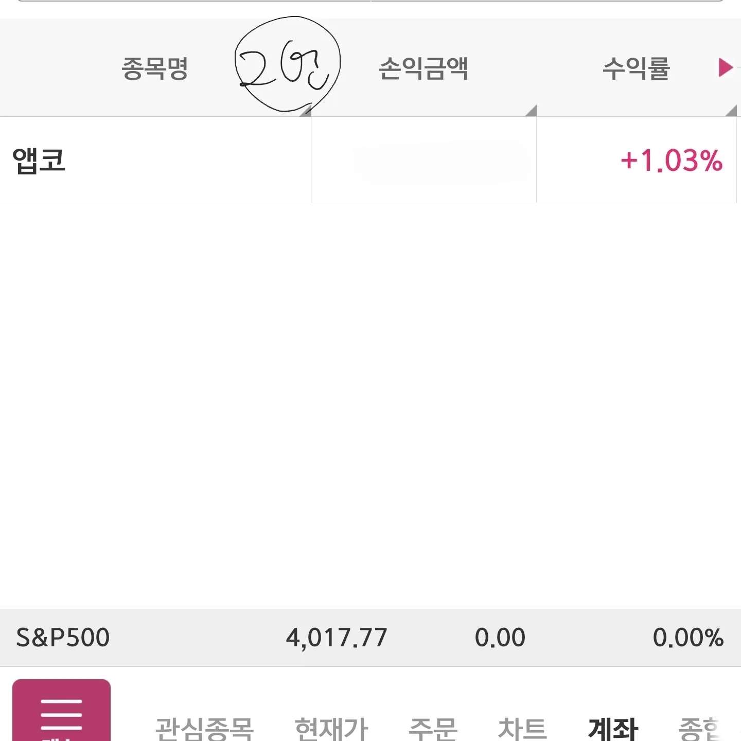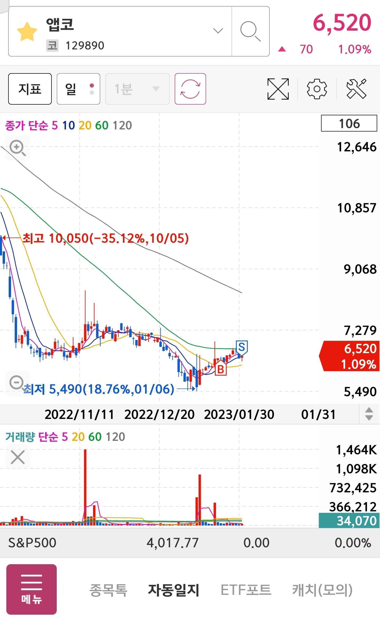2번 계좌의 앱코 라는 종목도 마찬가지로 전환선이 이탈 하였고 작년에 크게 손실 난 종목 이여서 다시 한번 자리 잡으면 매수 할 계획입니다.