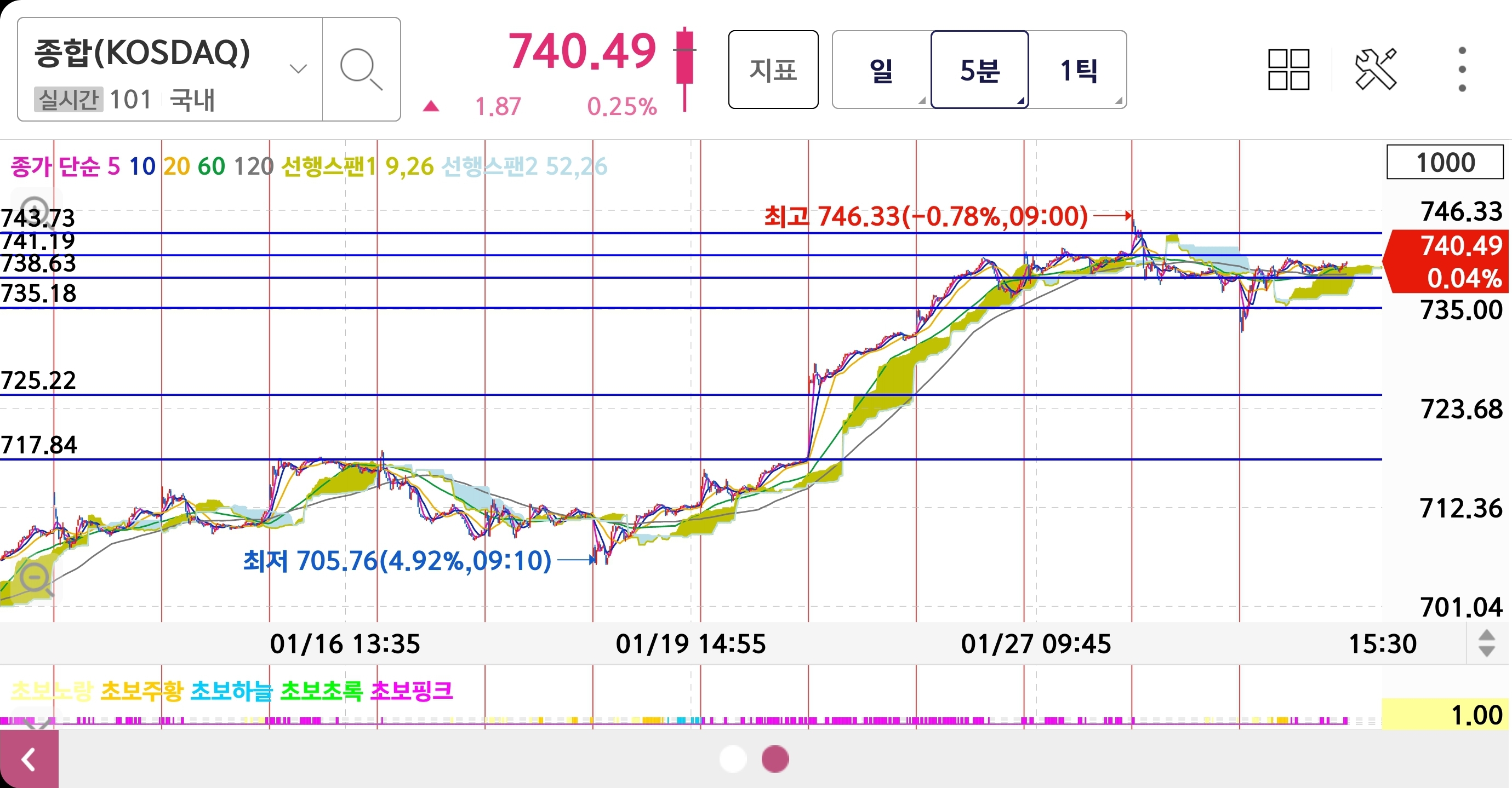 1분봉상 갭 하락으로 시작 하였으나 09시09분 금일 저점 인 732P를 찍고 반등 시작 09시29분 시가를 회복 하며 상승을 하고 09시50분 전일 종가를 회복 하여 11시18분 이전까진 전일 종가 기준으로 이탈, 회복 을 하였지만 11시18분 부터 본격적인 상승이 나왔습니다.