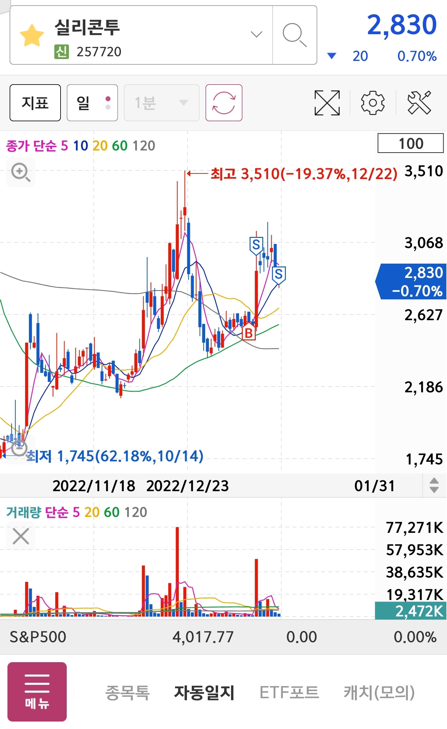 실리콘투 종목은 추세선은 우상승 유지 하고 있지만 저의 기준에선 단기고점에서 5일선이 깨져도 전환선만 깨지 않으면 가지고 갈 수 있겠지만 금일 전환선을 지켜주지 못 하여 전량 수익 실현 하였습니다.