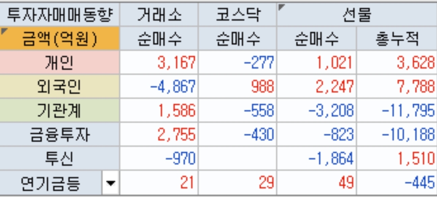 코스닥은 외국인의 매수로 인해 개인, 기관,금투 에서 수익 실현이 나왔습니다.