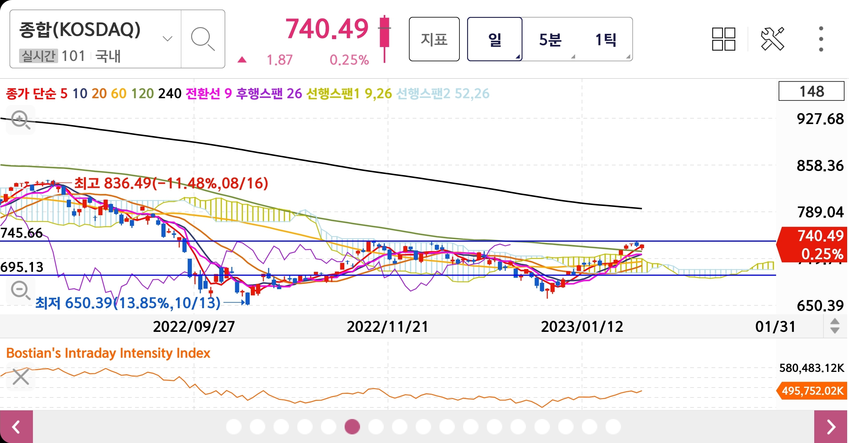 코스닥은 0.25% 오른 740% 양봉 마감 하였으며 갭 하락으로 시작 하였지만 5일선을 돌파 해 주며 추가 상승 기대감을 주고 있지만 전고 언덕인 745P를 돌파 해 줄 지 아니면 다시 하락으로 내려갈지 지켜 봐야 할 것 같습니다.