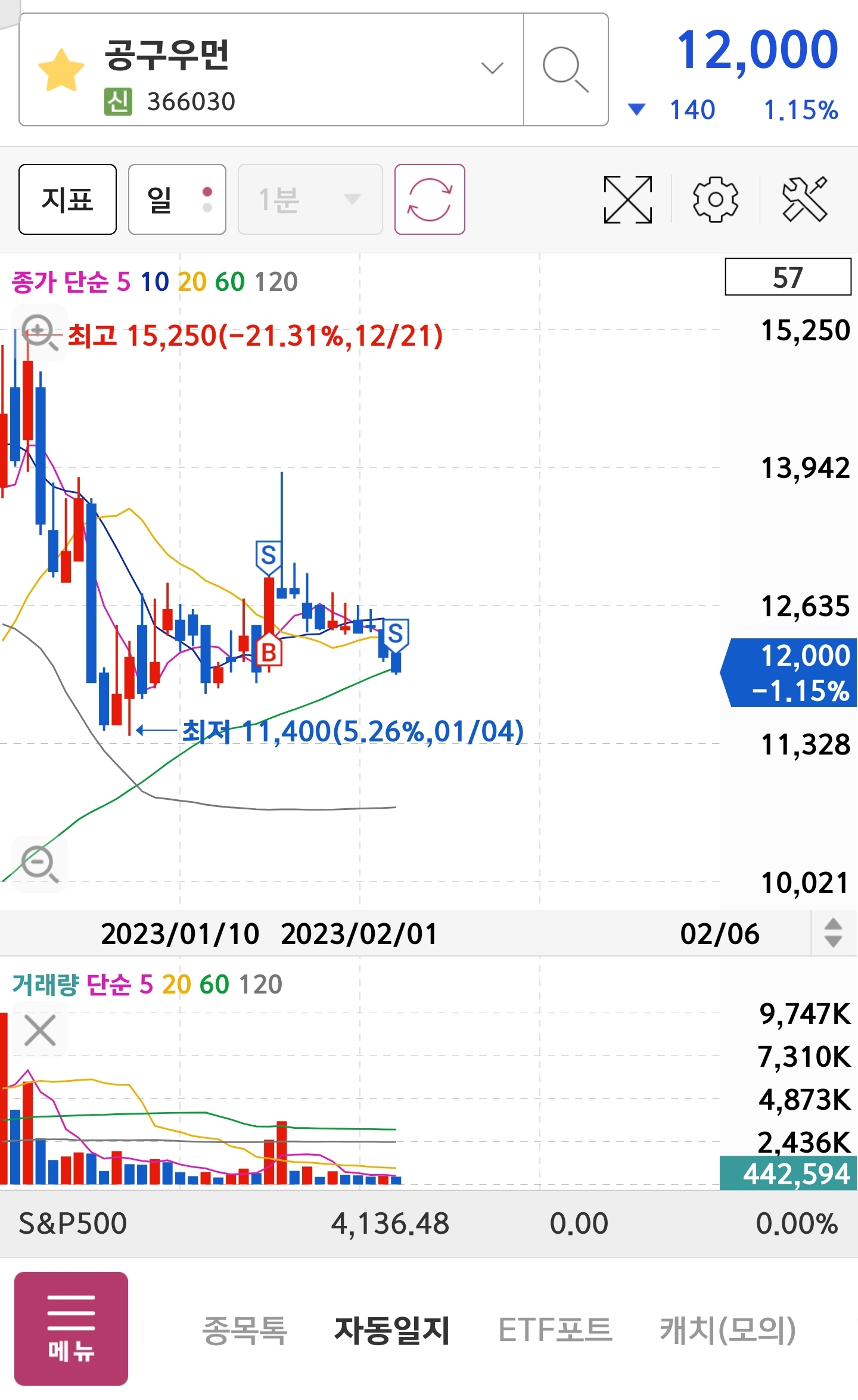 1번 계좌에 있던 공구우먼 종목 5일선이 20일선을 이탈 하여 추가적으로 하락으로 손실이 커지기 전에 남아있던 물량 전량 매도 손절을 하였고