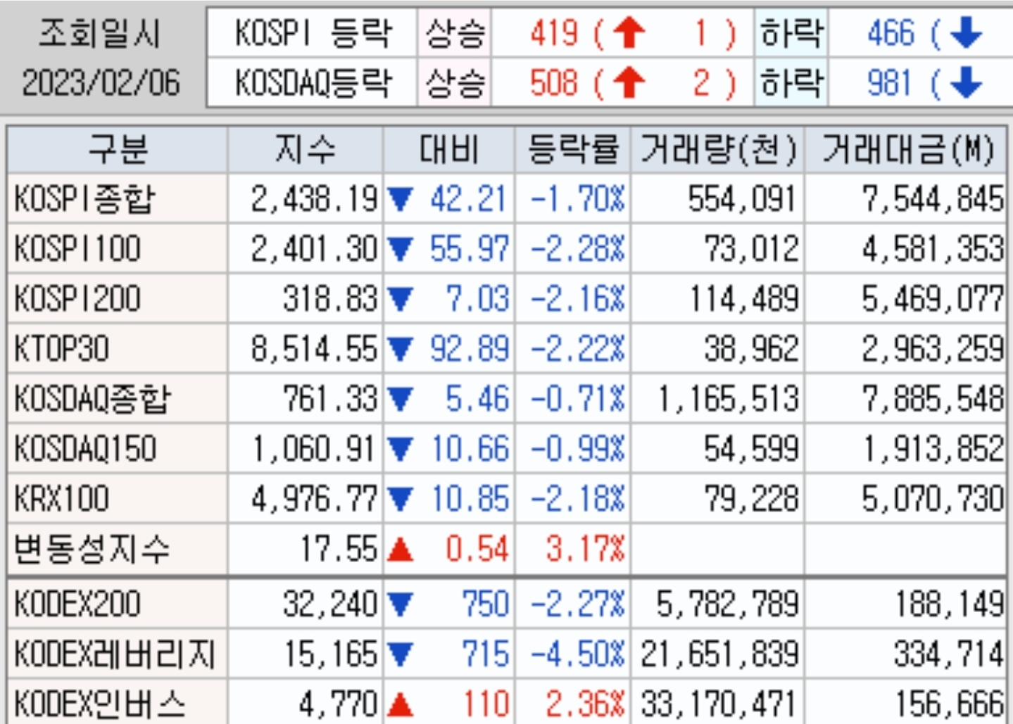 코스피는 419 종목이 상승을 하였고 466 종목이 하락을 하였습니다. 코스닥 종목은 508 종목이 상승 하였고 981 종목이 하락을 하였습니다. 상승 종목 보다 하락 종목이 많고 변동성 지수도 오르니 장이 안좋은 하루 입니다.
