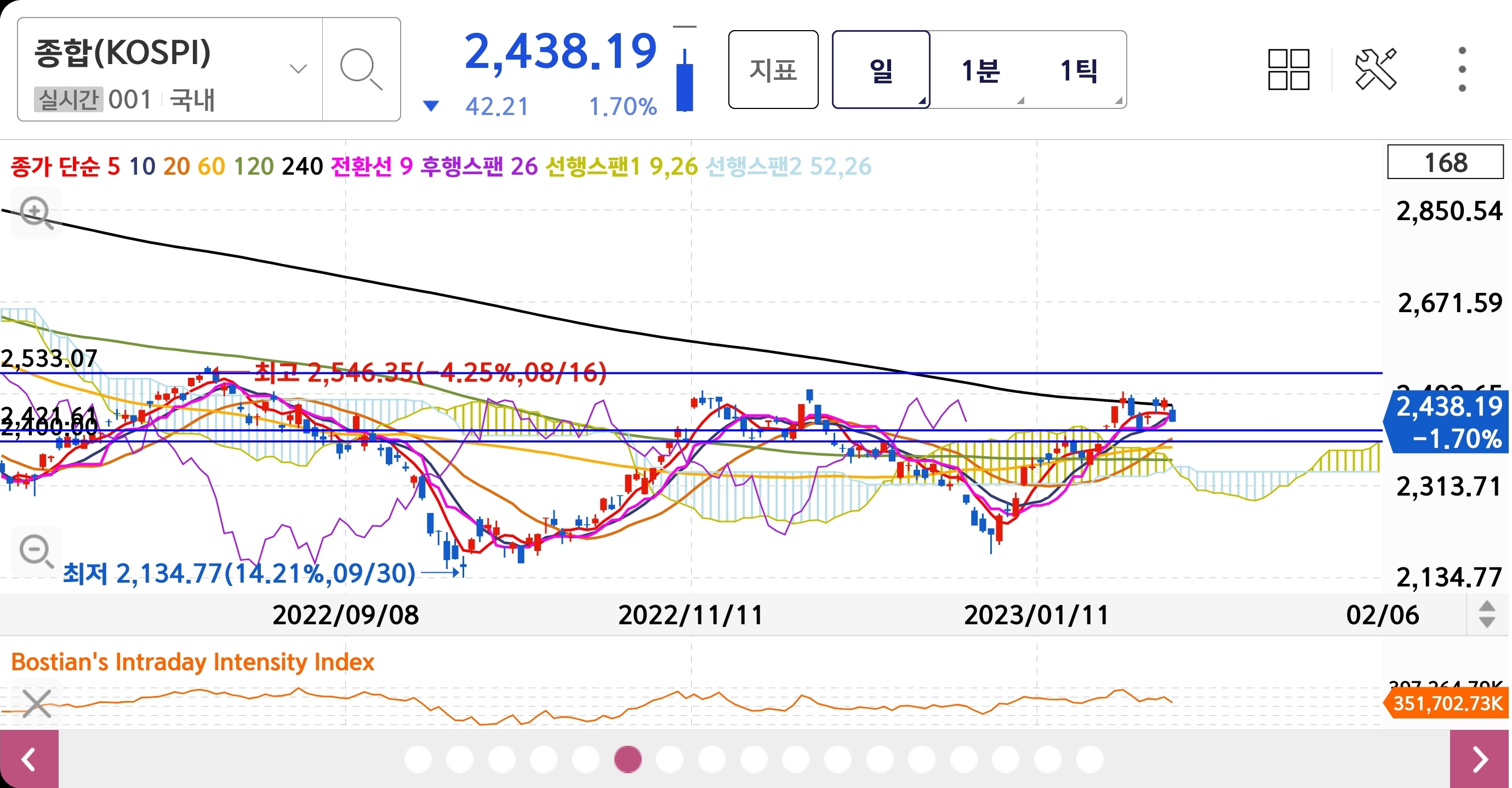 코스피는 1.7% 하락 한 2,438P 음봉 마감을 하였으며 5일선, 10일선, 전환선 도 이탈을 하였으며 작게 나마 현재 쌍봉을 그려 놓았습니다. 1월25일 갭상승 한 날 저가 2,421P 까지 현재 열여 있으며 만약 2,421P를 이탈시 갭 메우러 내려 갈 수 있어보입니다.
