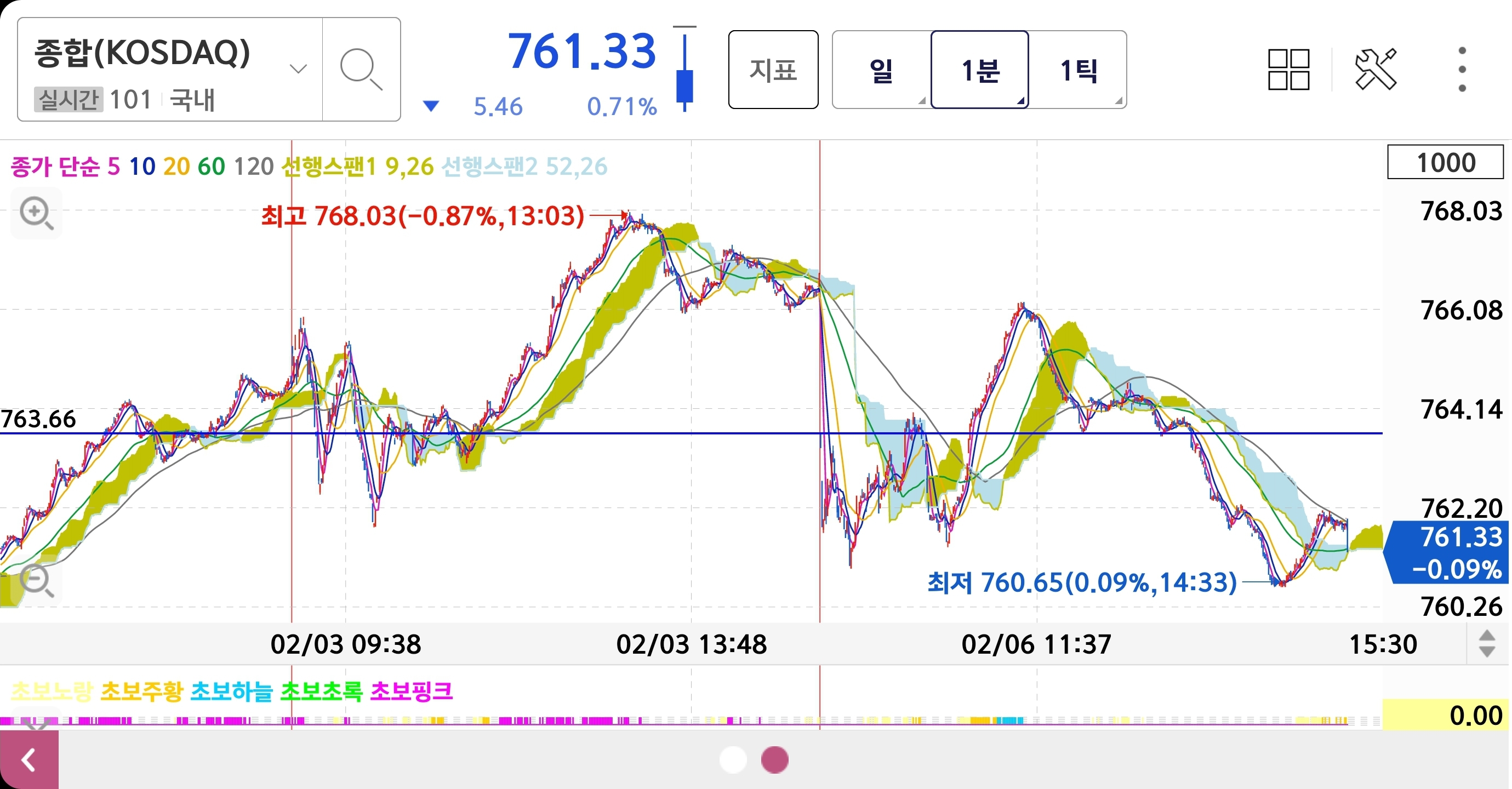 1분봉상 갭 하락을 하여 쌍바닥 패턴을 보인뒤 10시48분 시가를 회복하여 상승을 하였으나 11시25분 금일 고가 766P를 찍고 하락을 하여 시가 마저 이탈 뒤 장마감 동시호가에 추가 매도 물량이 나온채 마감 하였습니다.