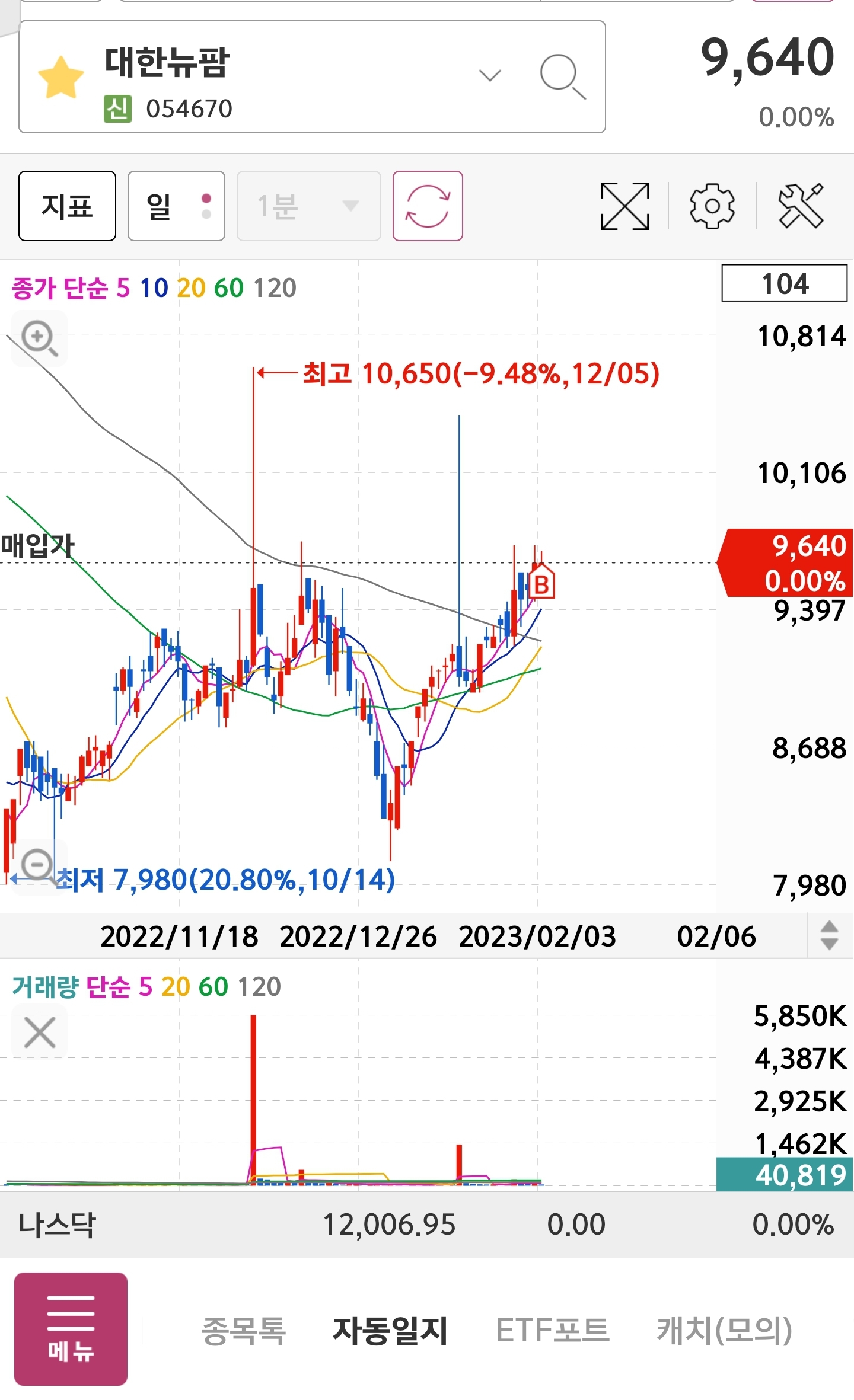 검색기에 있던 대한뉴팜 종목을 1차 매수를 하였습니다. 지수랑 비교하여 강하다는 판단하에 매수를 하였습니다.