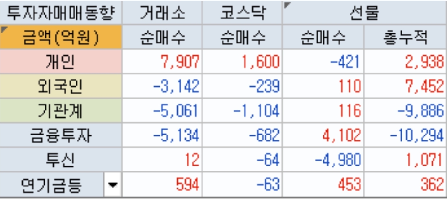 양시장 외국인, 기관, 금투 는 현물은 매도, 개인들은 매수의 포지션에서 서 있는 하루 였습니다.