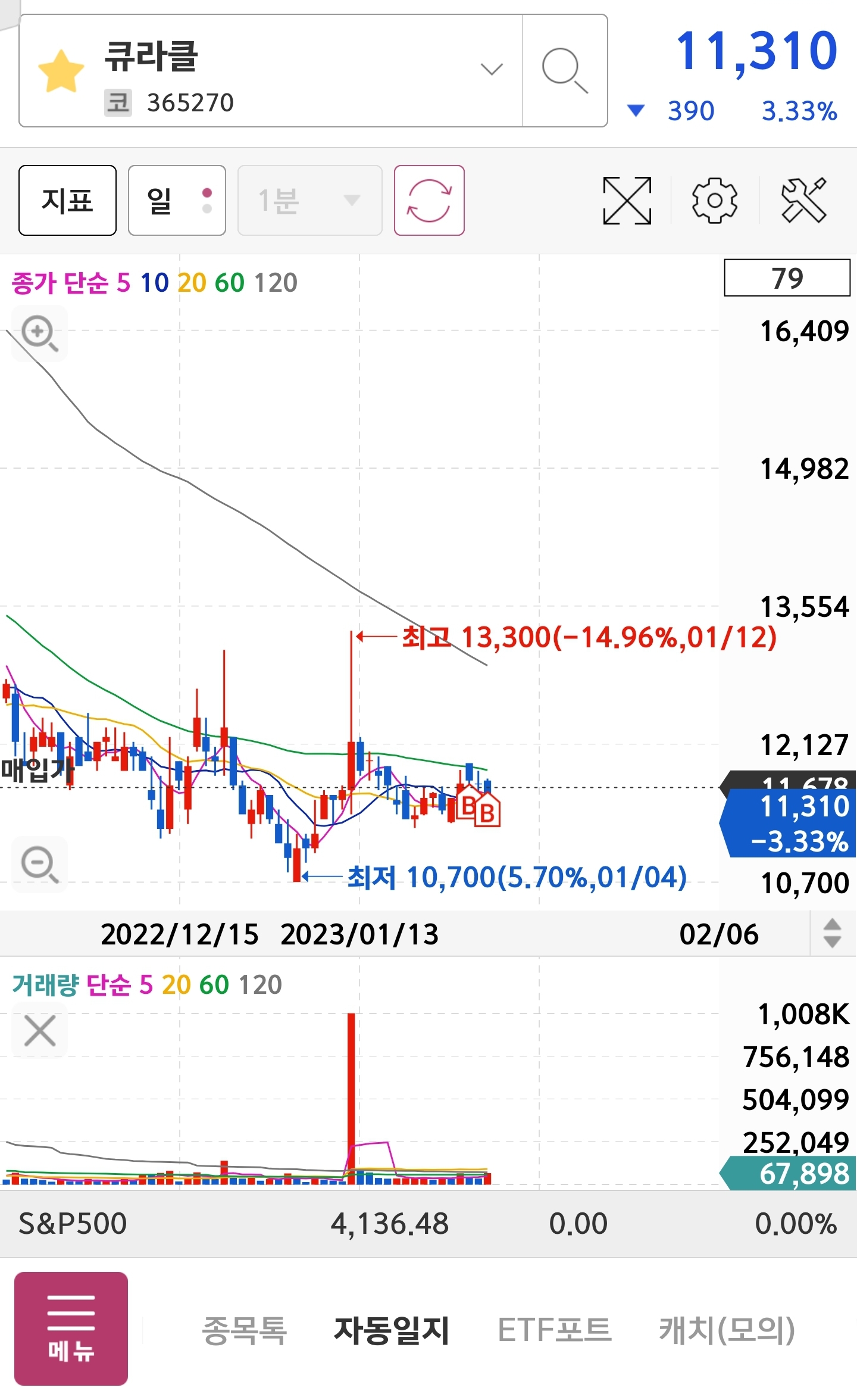 2번계좌 큐라클 20일선이 닿일때 2차 매수를 하였으나 장마감엔 20일선도 이탈 하였습니다. 내일 종가에 20일선을 회복 하지 않는다면 손절 계획 입니다.